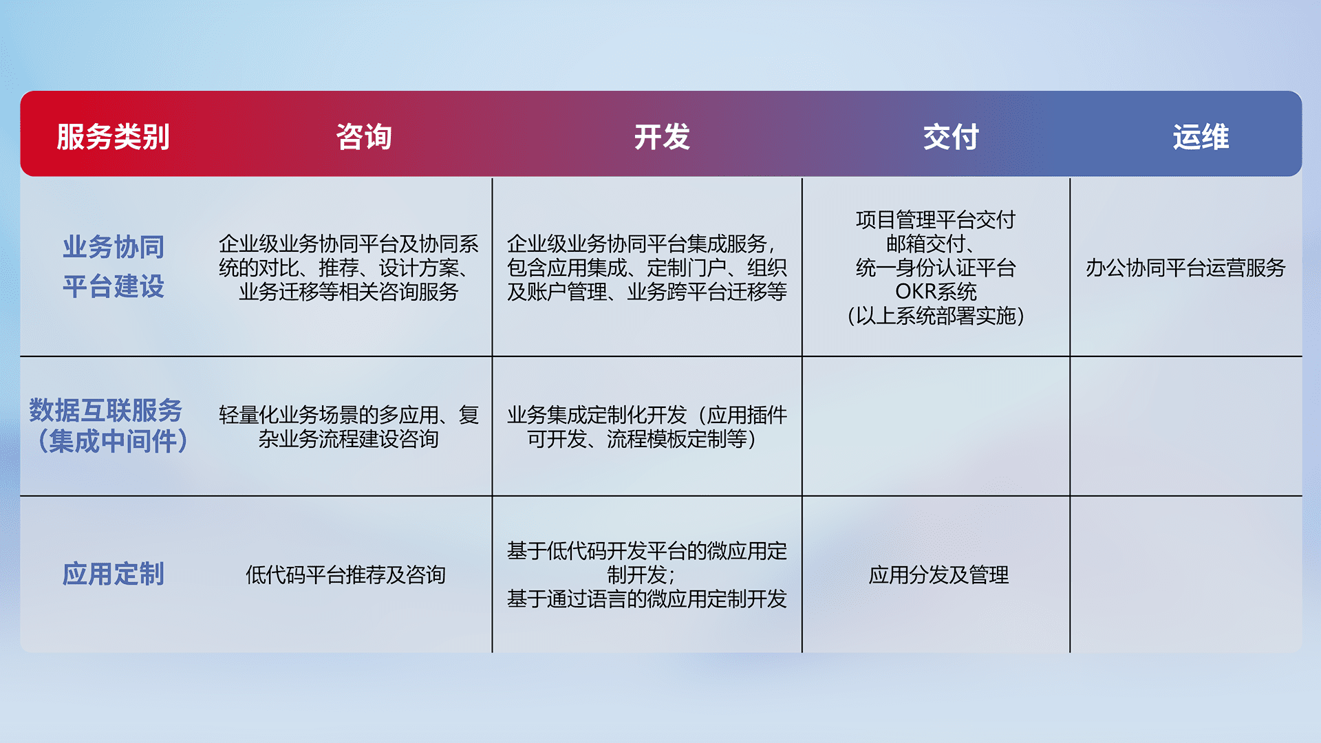 针对钉钉、、、企微、、、、IDaas等平台级产品提供产品的规划、、、方案、、、交付、、、、定制化开发等服务,,,实现如统一协同办公、、、、智能客户服务、、、混合会议管理、、、、智能数据查询、、、、等业务场景,,,,实现数字化转型。。